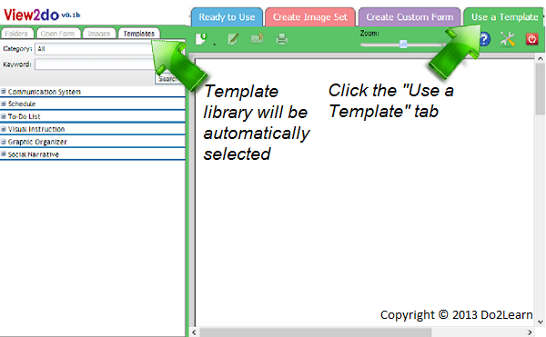 - Making great-looking schedules is easy using View2Do’s provided templates. We’ll begin by selecting the green Use a Template tab along the top of the workspace. This will automatically select the Template library on the left hand side of the screen.