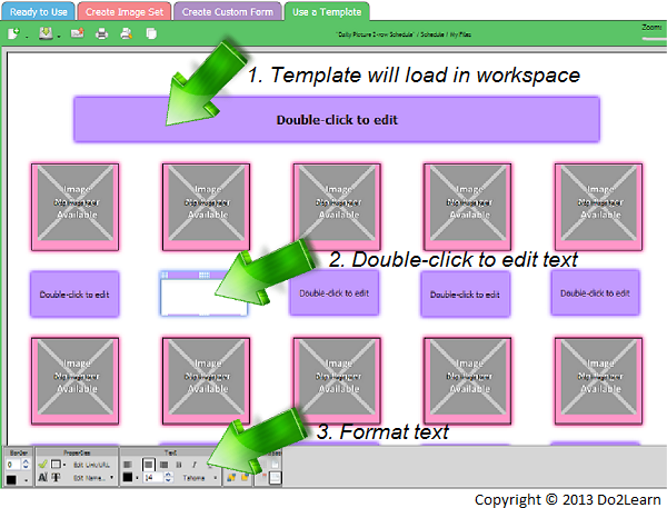 - The template will appear in the workspace as a preformatted set of editable image and text fields. To add text, double click on one of the text fields. A text box will appear where you can type the desired text. The appearance of the text can be changed using the text-formatting menu at the bottom of the workspace.