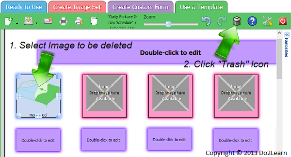 - If you’d like to make a change to an image in a template, select the image and then click the Trash button, represented by a trashcan in the top right corner of the workspace.