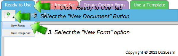 - In the Ready to Use workspace, click the New Document button located directly beneath the blue Ready to Use tab, and select New Form from the dropdown menu.