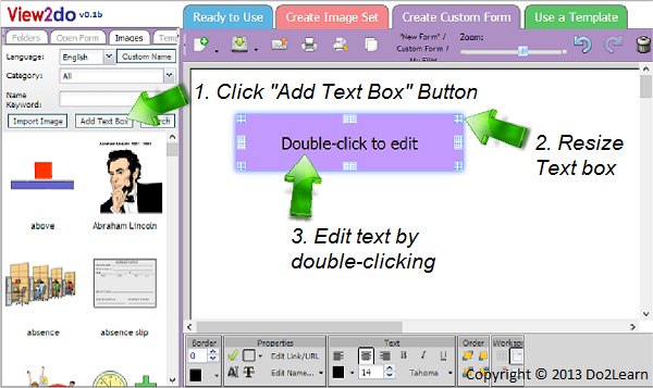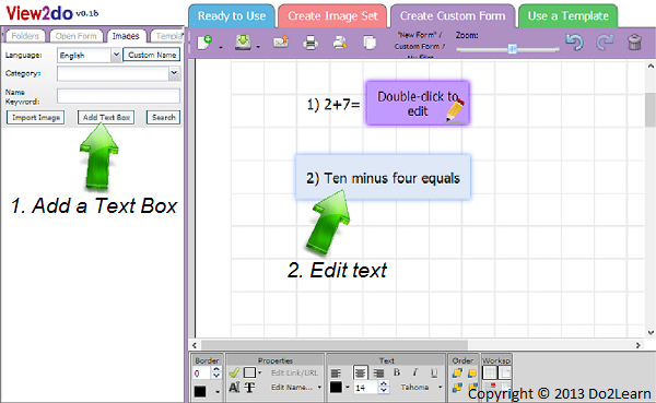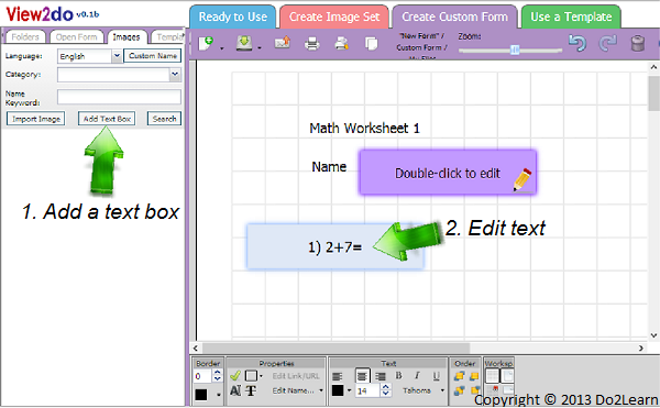 - To add a title to the worksheet, click on the Add Text Box button, located under the Images tab in the image library on the left side of the screen. A purple text box will appear in the workspace. Drag the text box to the desired place on the page, and resize it by dragging one corner or side to the desired size. We’ll put ours in the top left corner of the worksheet. Double click inside the purple box to reveal an editable text region and enter the desired title, Math Worksheet 1.