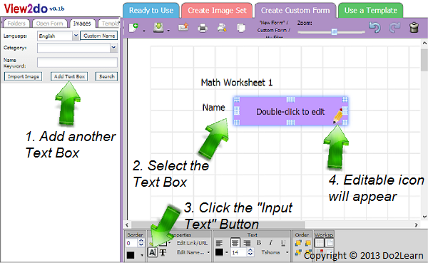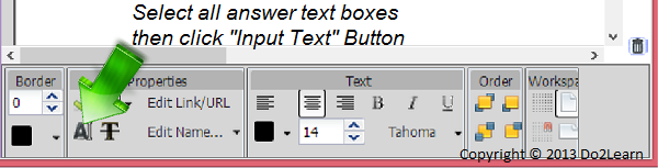 - To streamline the process of creating answer boxes, first make text boxes for each of the problems on the worksheet. Then, before adding the answer boxes, click on the Input Text button. When the Input Text button is highlighted, all text boxes added will be editable fields.