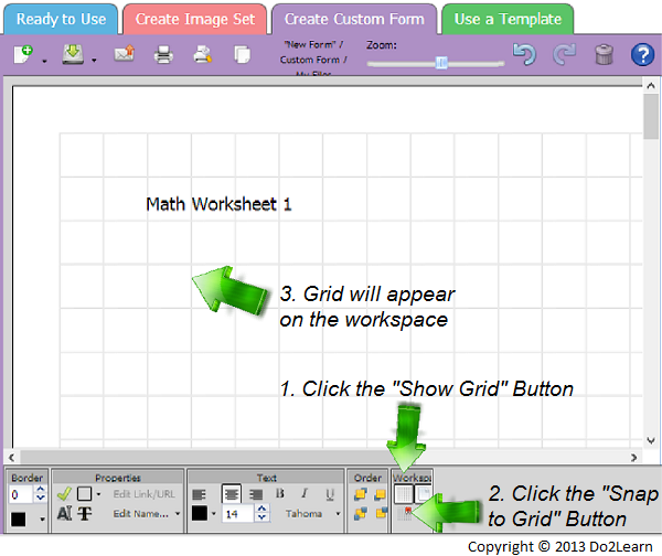 - To help you keep your worksheet organized, it’s helpful to use the grid guideline feature. On the Workspace toolbar, located at the bottom of the screen, click the Show Grid button. A pale gray grid will appear on the workspace. You can use these to manually line up your text boxes, or you can click on the Snap to Grid button, directly below the Show Grid button. This will cause any text boxes or images to snap to the nearest grid line. It’s easy to make worksheets where the problems and answers align using this feature.