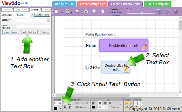 - Next to the addition problem, make an Input Text text box as described in the last step. When the student receives the worksheet, they’ll find the problem, 2+7=, and a space where they can click to enter their answer.
