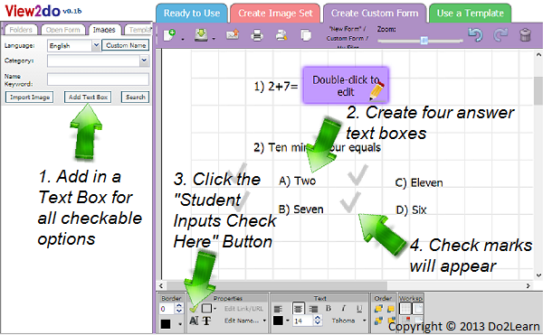 - This will add a checkable box to every text box. With this option selected, create four textboxes, one for each of the possible answers. We’ll use the answers ‘A) Two’ ‘B) Seven’ ‘C) Eleven’ and ‘D) Six’ with one answer in each of the four text boxes. When the student receives the worksheet, they’ll be able to click on their desired answer, and a green check mark will appear.