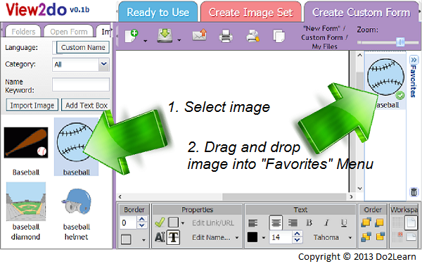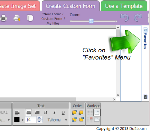 - In the Create Custom Form workspace, there is a Favorites menu on the right side of the screen. Here, you can store your favorite images and drag them into the workspace. This is easier than repeatedly searching through the library.