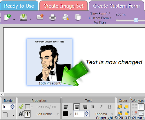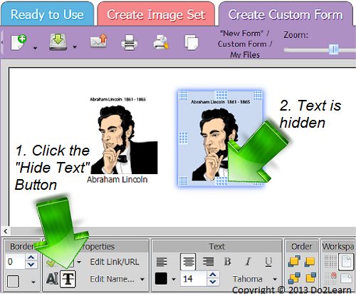 - If you wish to hide the text included below an image, select the desired image and then click the Hide Text button in the Properties toolbar.