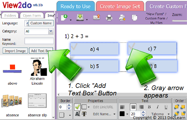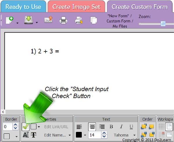 - Say you have written a multiple choice question. After creating a text box with the problem, select the Student Input Check button in the Properties toolbar. This will add a checkable box to every text box or image added to the workspace.