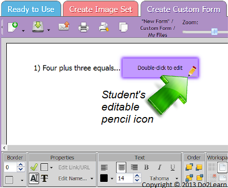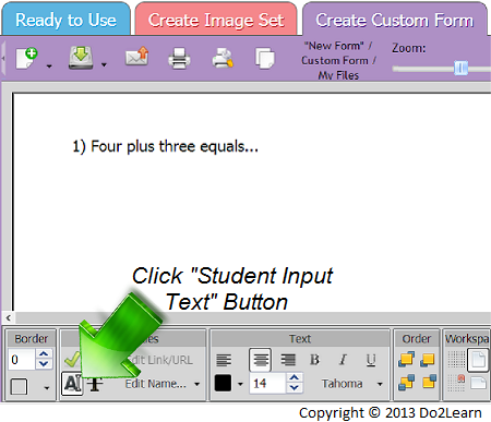 - Next, we’ll use the Student Input Text button. This option is used when creating student worksheets that require fill in the blank answers. After creating a text box with the problem, select the Student Input Text button in the Properties toolbar. When this button is highlighted, all text boxes added will be editable fields, indicated by a small yellow pencil in the lower right hand corner of the box.