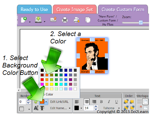 - To change the background color of text boxes or images, select the desired object and then click the Background Color button in the Properties toolbar. A pop-up menu will appear, and you can choose from a variety of colors.