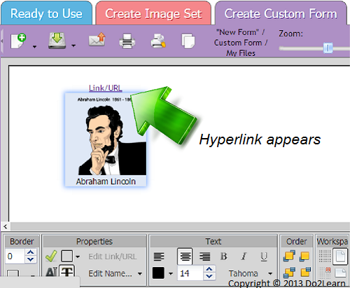 If you wish to customize an image set or make a student worksheet more interactive, use the Properties menu located near the bottom of the workspace. This menu has several options, such as adding background color, attaching hyperlinks to objects, and allowing students to input text or check marks.